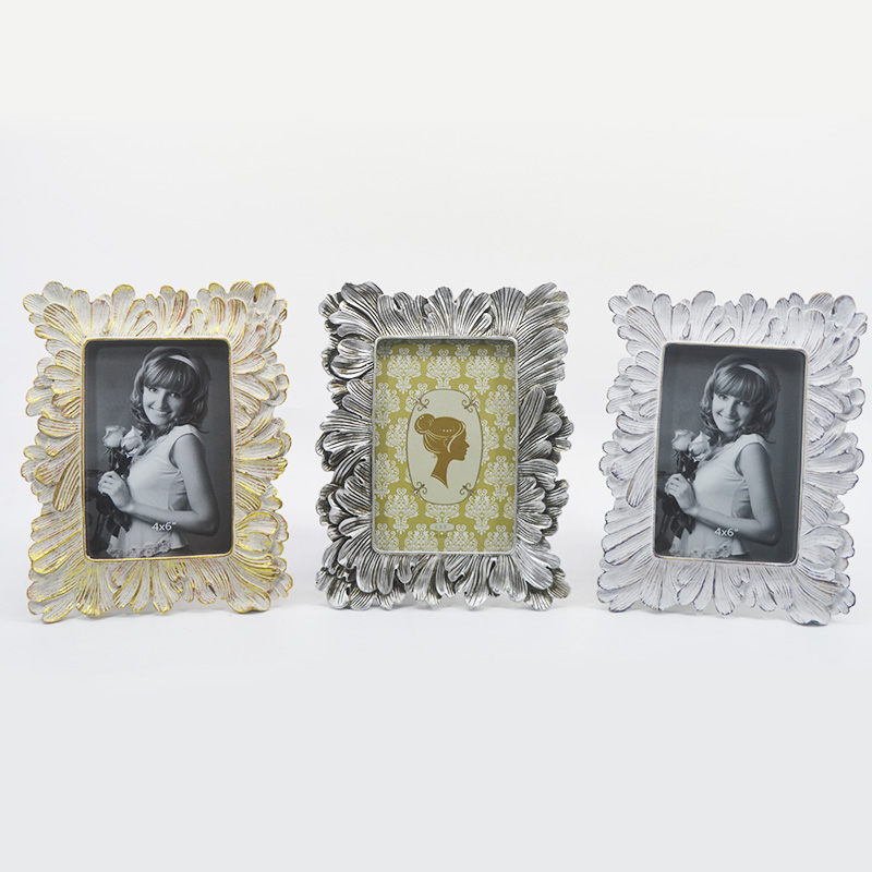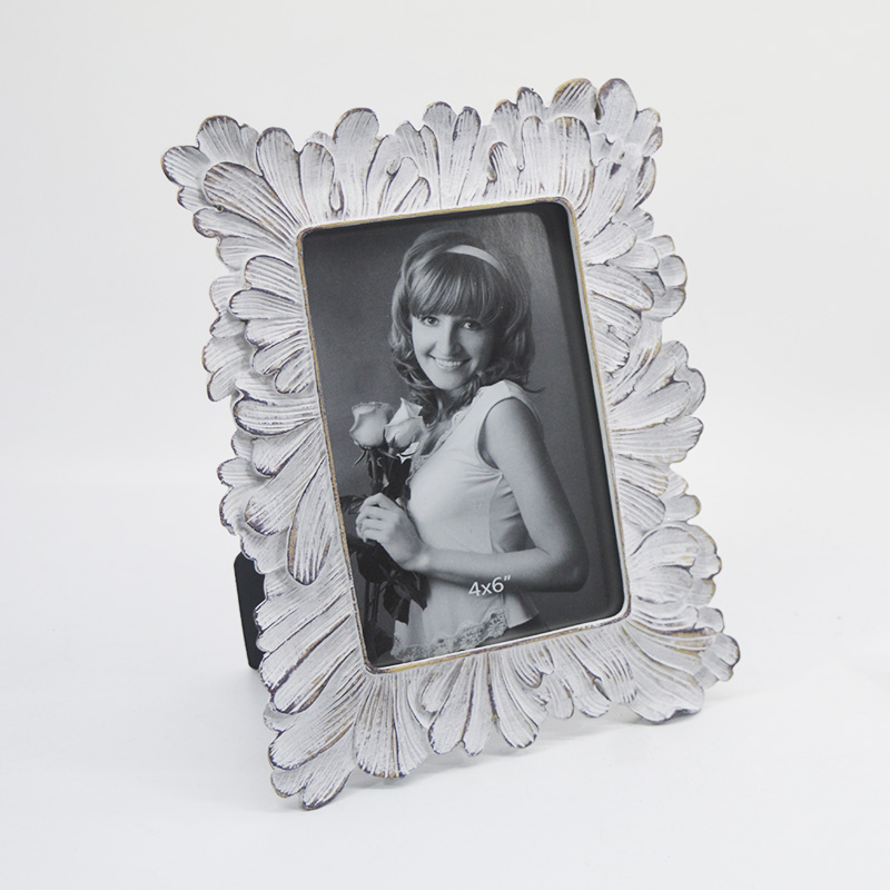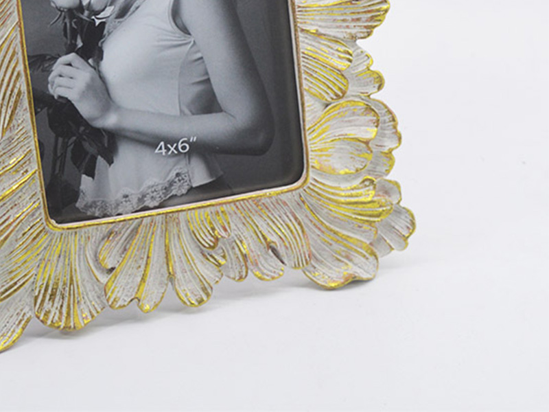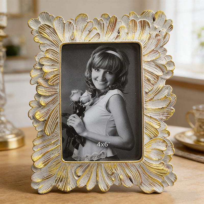 This photo frame is a resin handicraft in a European vintage style. It features a border shape made of layered and spread-out petals. Through the combination of an aged white background and gold painting techniques, it presents a light and luxurious retro look. It is suitable for 4×6-inch photos and can be placed on home desks or dressing tables as decoration. It can also be used as an exquisite gift for weddings, house moves, or anniversaries, adding a romantic sense of ceremony to life.