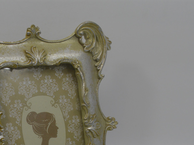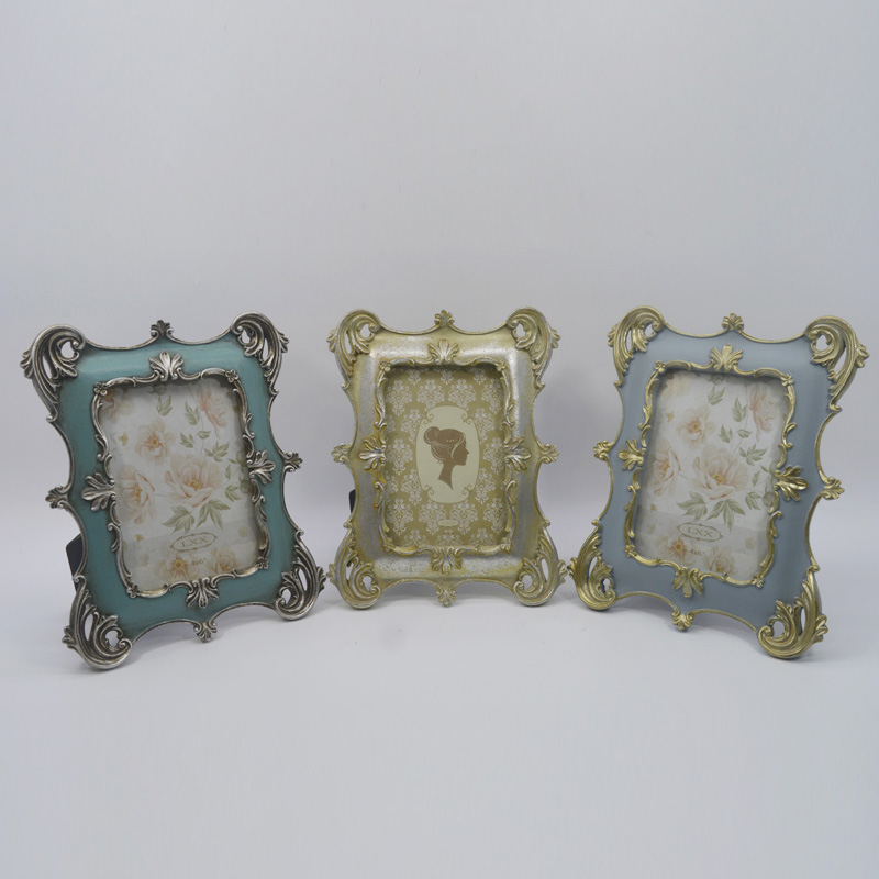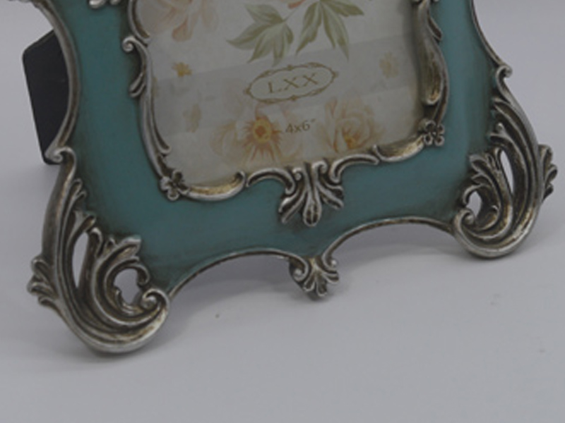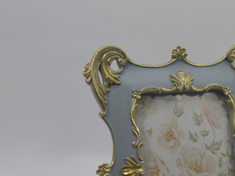 We provide high-quality polyresin photo frames with a vintage baroque design. This Model 1767 features a hand-painted antique blue and gold finish, suitable for home decor retailers, gift shops, and wedding supply distributors. The product combines durable resin construction with a real glass front, ensuring high perceived value for your end customers.