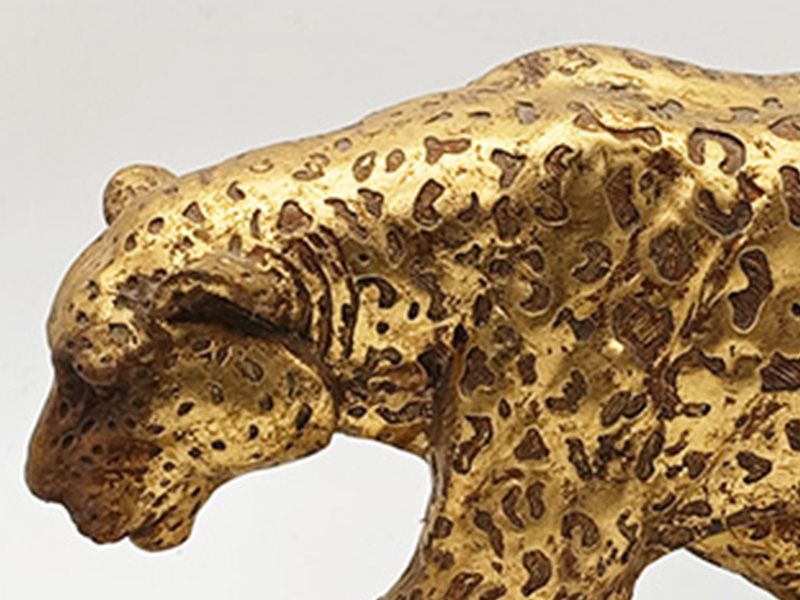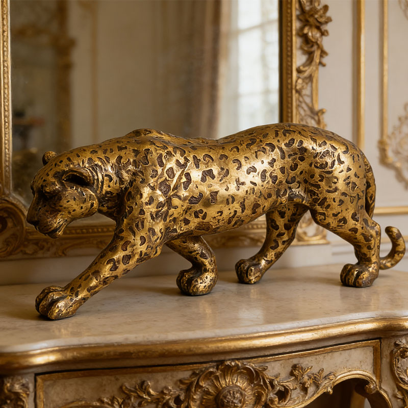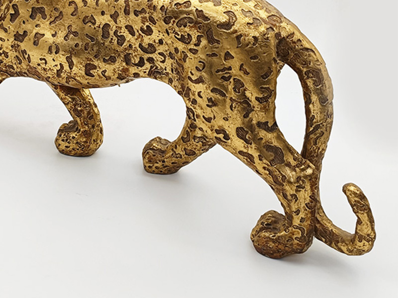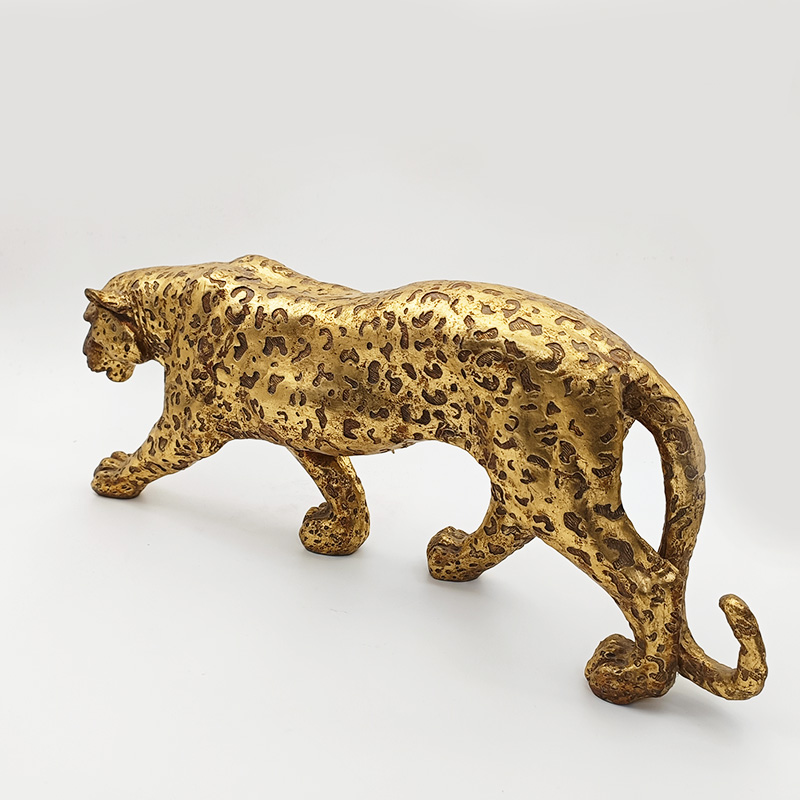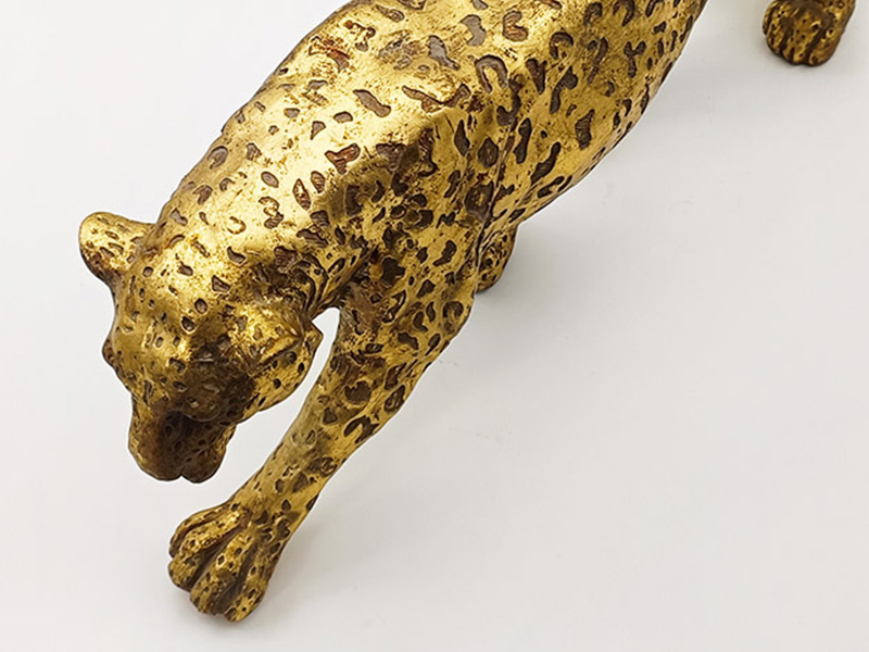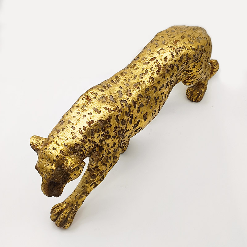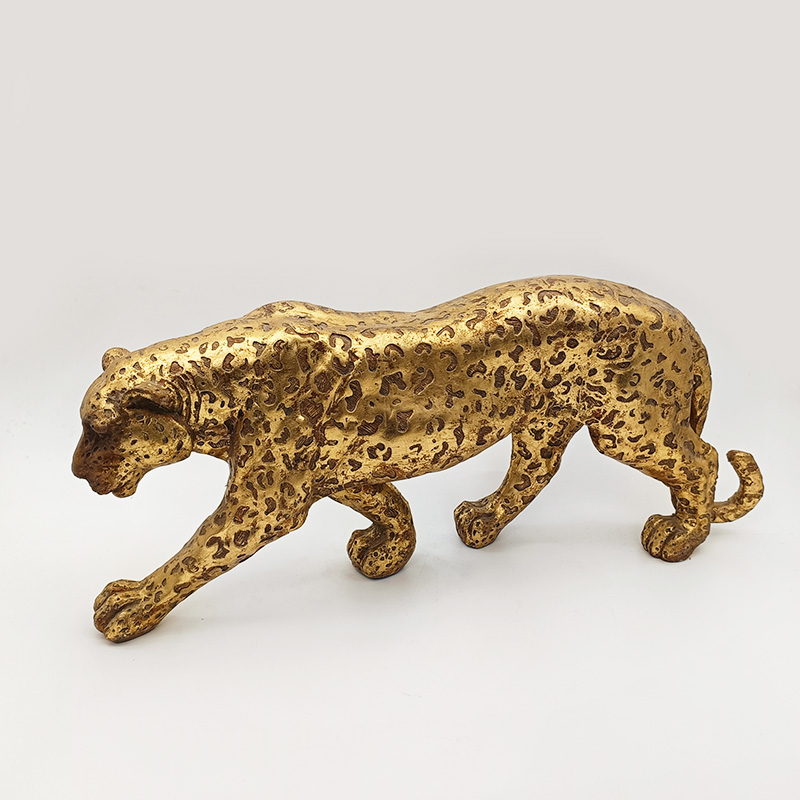 This gilded cheetah figurine is meticulously crafted with realistic techniques, depicting the dynamic posture of the cheetah as it walks on all fours. The overall surface is covered with mottled gilded textures, and the matte gold finish is combined with a frosted metallic texture, recreating the retro charm of faux copper gilding. The figurine precisely portrays the streamlined body and stretched limbs of the cheetah, with a low-curved head and a poised posture, complemented by detailed features, claw details, and distinct layers of the leopard's skin texture. The uneven leopard skin patterns on the body are clearly defined, and the realistic carving of the muscle lines gives the entire figure a sense of power.