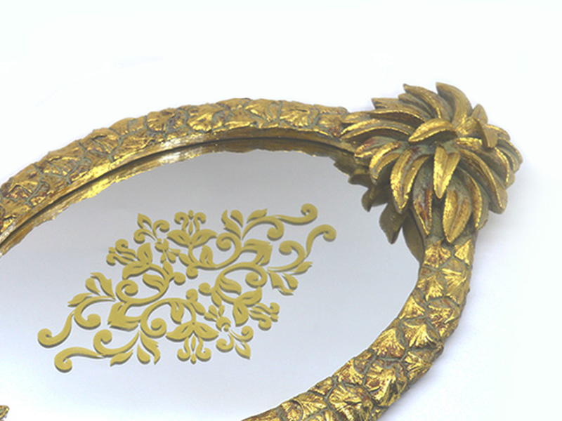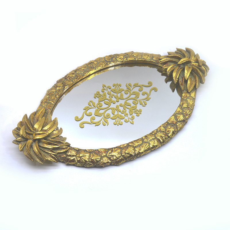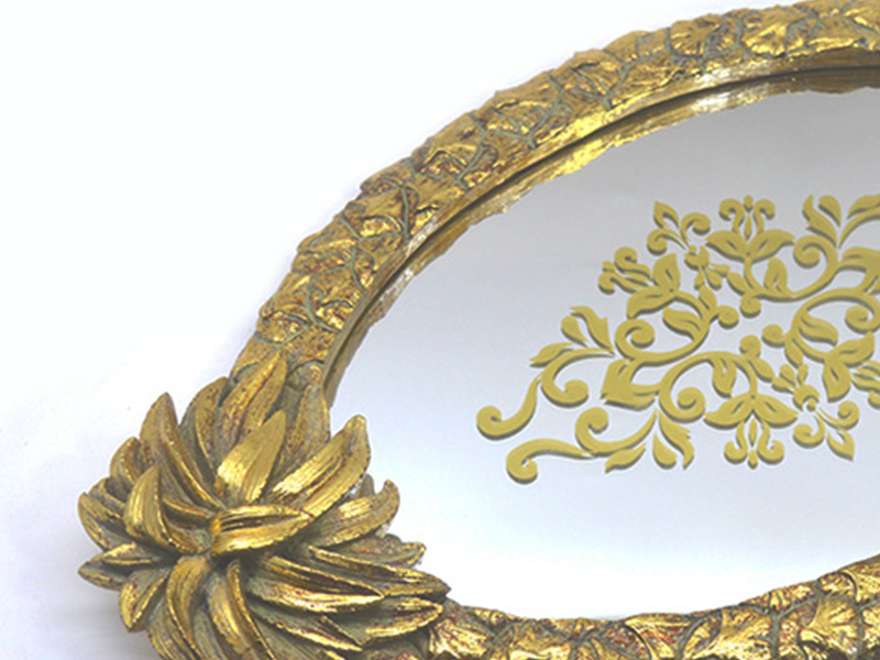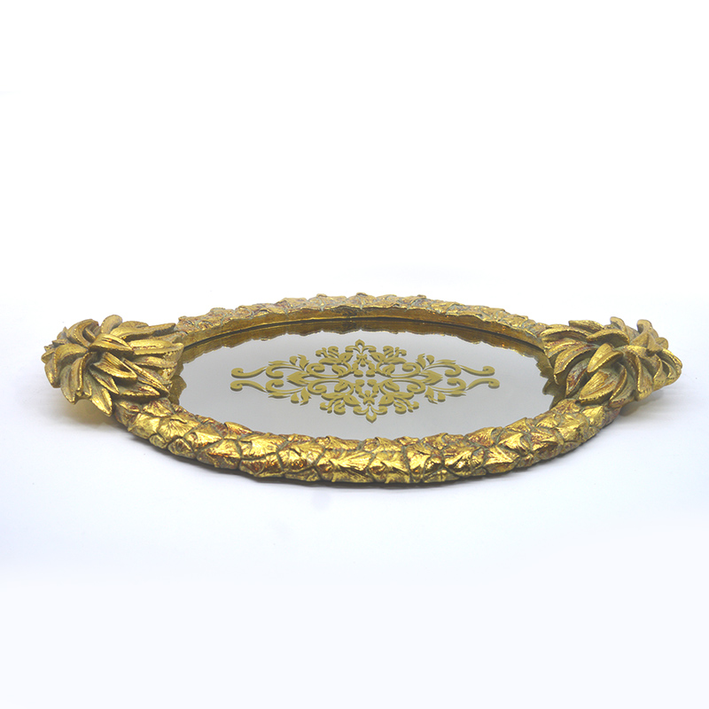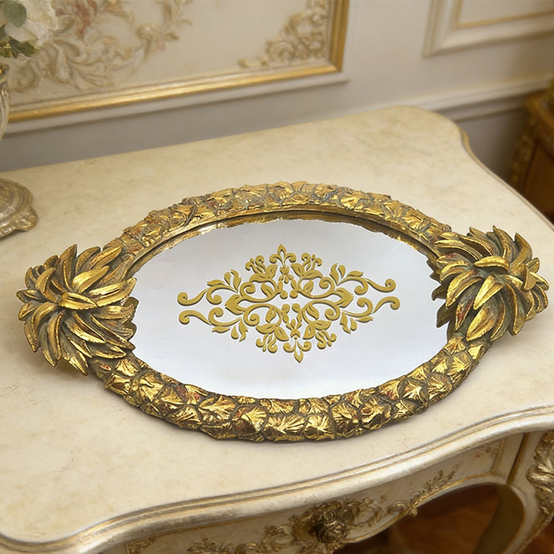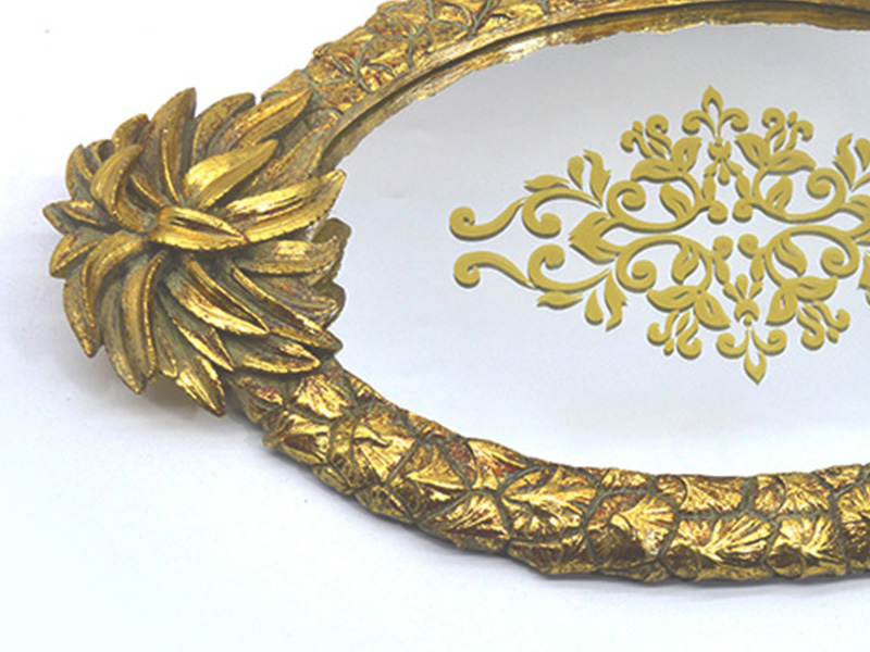 Mirror engraving: The tray is embedded with a high-transparency silver mirror. In the center of the mirror surface, there is an engraved European scroll pattern. The pattern lines are smooth, and the edge of the mirror is treated with glaze sealing, making it less prone to chipping or scratching