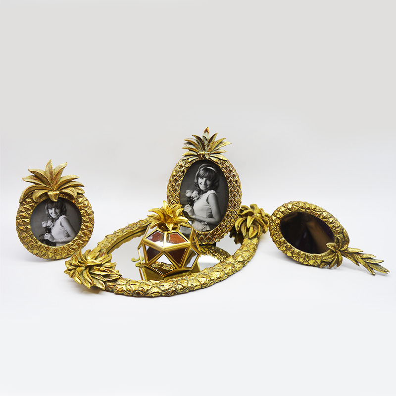 This retro gold foil-patterned pineapple relief resin mirror tray is designed with a European court style as the core. The two side handles in the form of three-dimensional pineapple flowers are intricately carved,
