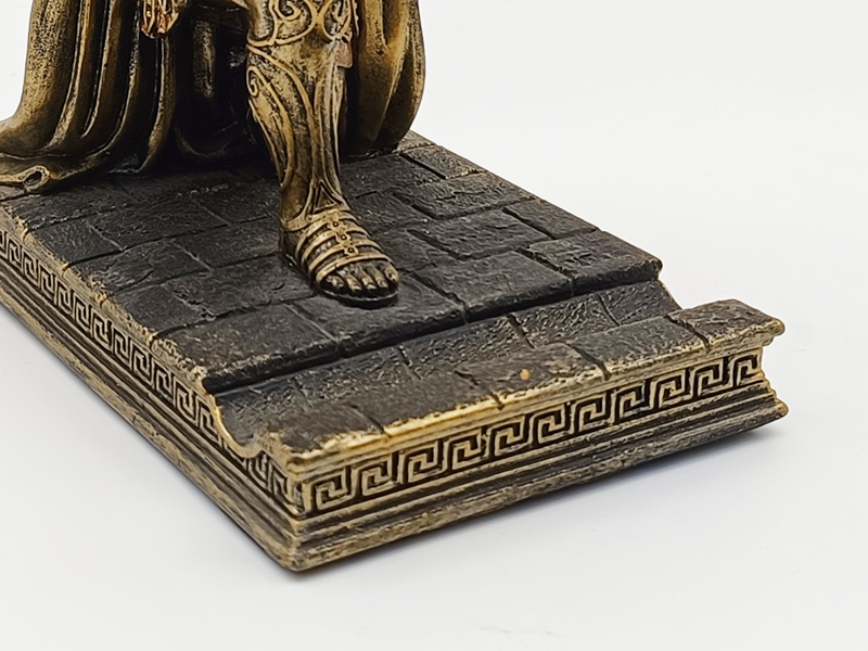 The main body is made of resin material: the surface is treated with antique copper-gold effect, presenting a matte metallic texture. Some areas (such as the helmet plume, the gaps in the armor) are given a dark antique effect to enhance the retro layering effect; the base is in imitation of stone texture, and the edges are decorated with Greek scroll patterns, adding a touch of classical charm.