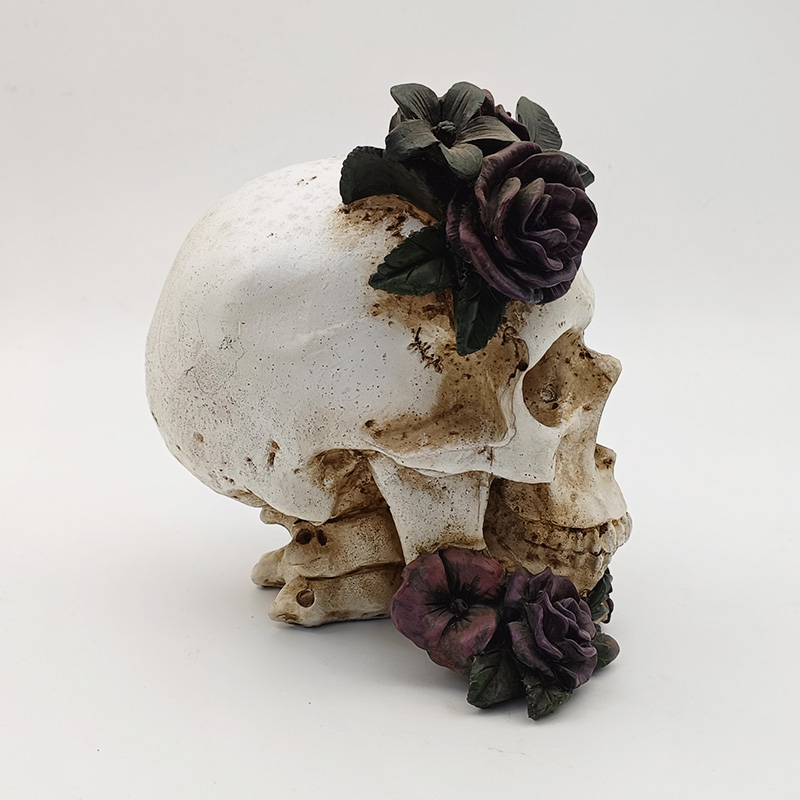 Flowers and decorations: On the top of the skull and at the lower jaw, there are three-dimensional deep purple roses. The petals are clearly layered and have fine textures, transitioning from deep purple to dark pink. The texture is very realistic. Next to the roses,