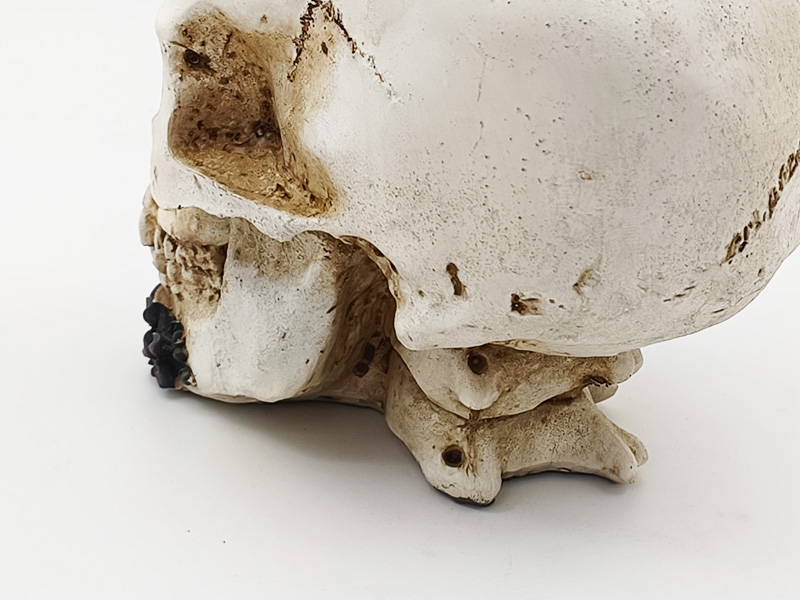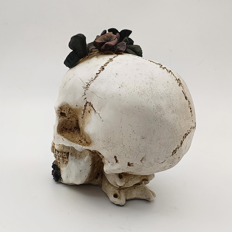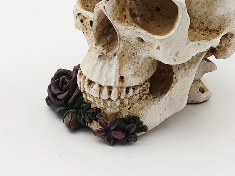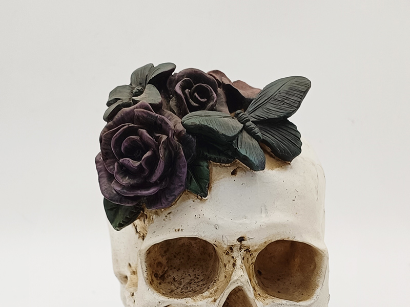Basic coloring: The main body of the skeleton is coated with 2-3 thin layers of matte white paint. After drying, it is aged and stained with dark pigments to enhance the bone groove texture; the roses are colored in layers (dark purple base color + dark pink gradient), the leaves are painted dark green, and the butterfly is done in black and white or dark purple contrast, all with fine lines to outline the detailed patterns.