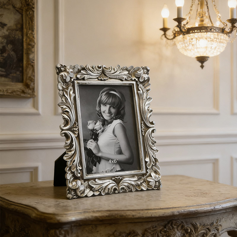 ♥ European-style photo frame with vintage silver engravings ♥ Frame size 4x6 / 5x7♥ With clips for easy photo changing and hooks on back for hanging |