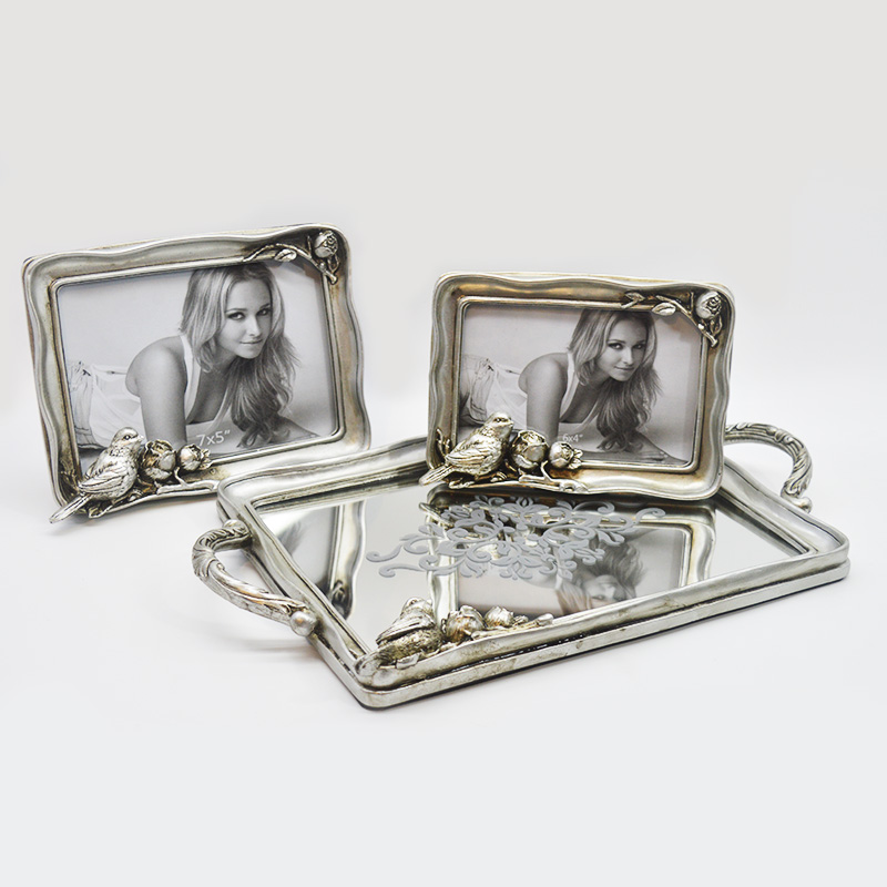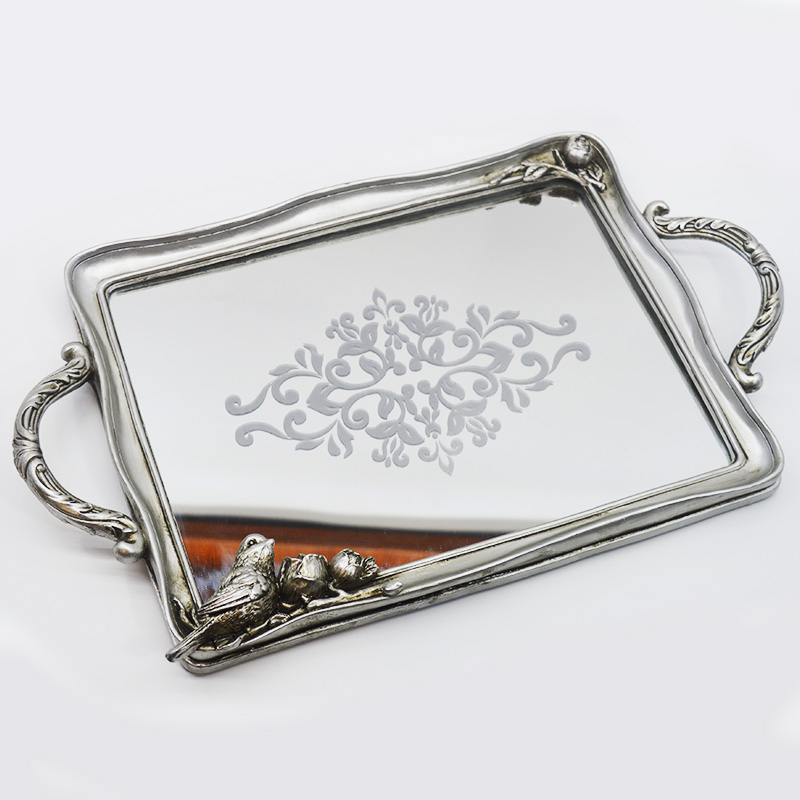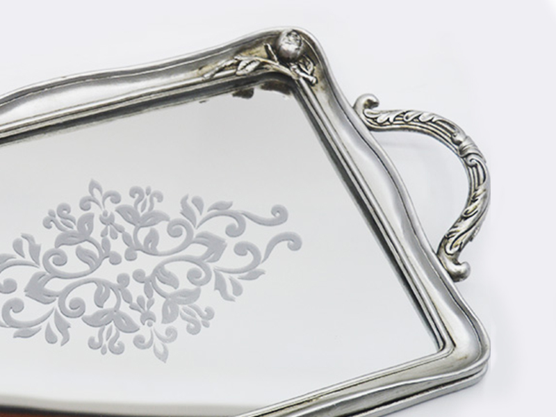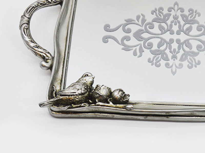 The main frame is made of resin material, with a retro-aged silver plating treatment on the surface, presenting a matte metallic texture; the inner core of the tray is 3mm thick high-definition mirror glass, which combines both decorative and practical features.