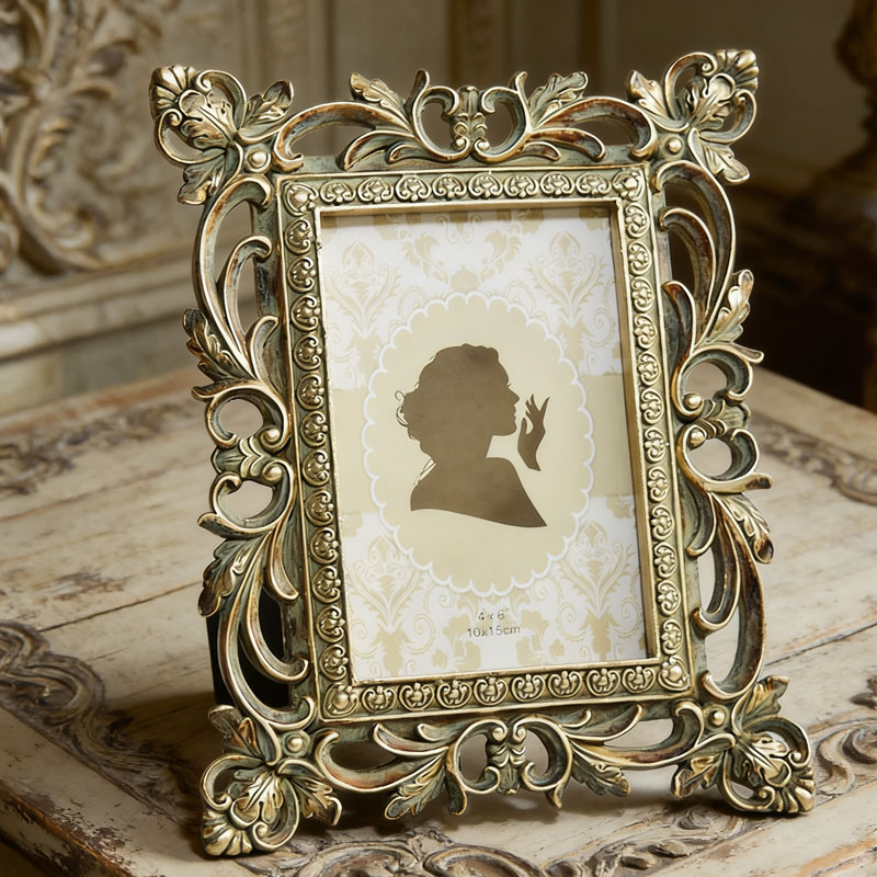 This European-style vintage carved photo frame is made of resin as the base. It replicates the three-dimensional relief and scroll pattern hollow design of the Baroque court style. The surface is treated with an aged green-gold technique, giving it a retro and aged texture. It is suitable for 4×6-inch (10×15cm) photos. It comes with a stable display stand and can be placed on a desk, fireplace, entranceway or bedside table, adding a classic and luxurious atmosphere to the home. It is both a practical photo carrier and an artistic decorative item. It is suitable for various home styles such as European, retro, and French, and can also be used as a gift for weddings, anniversaries, or retro-themed occasions.